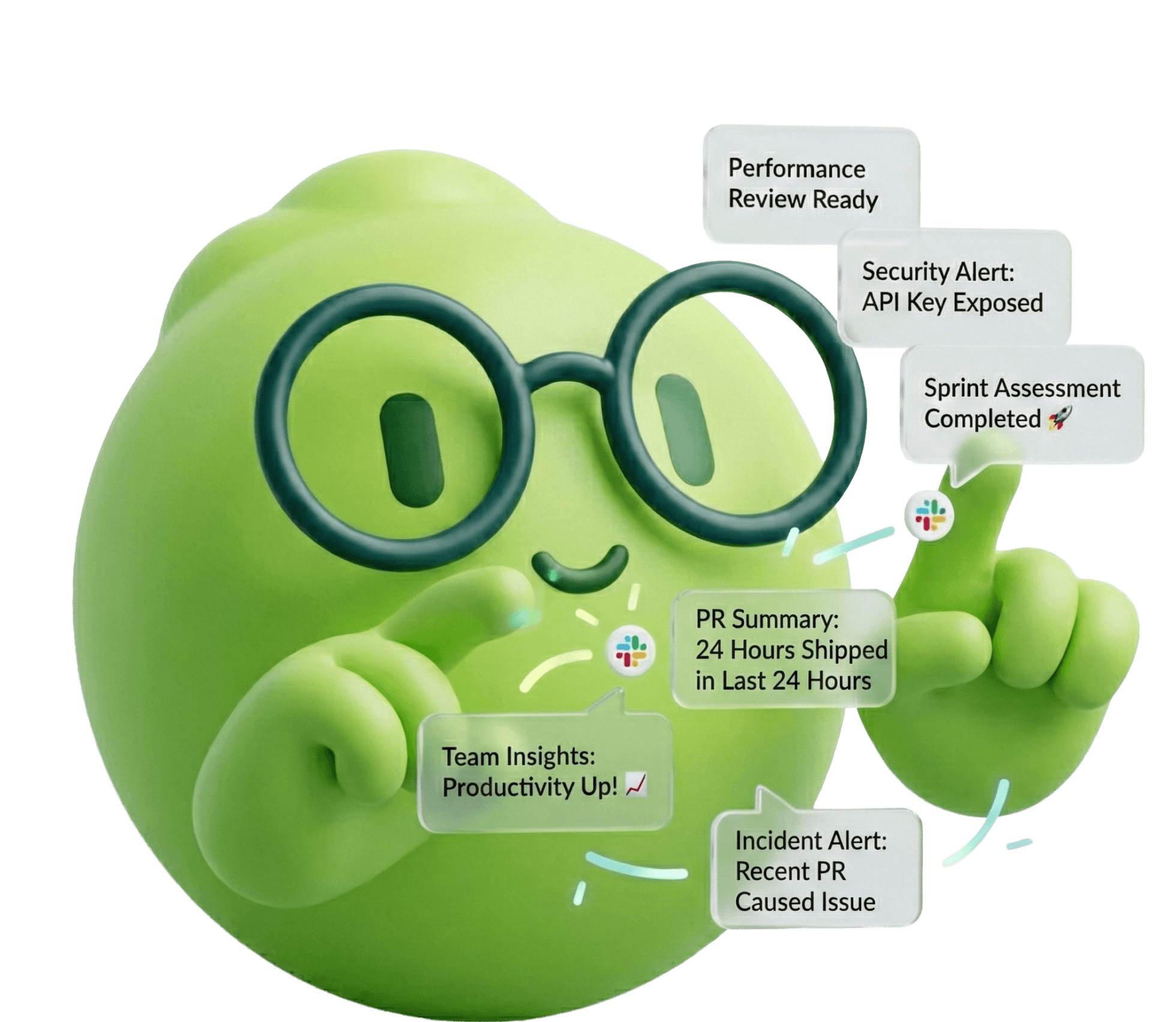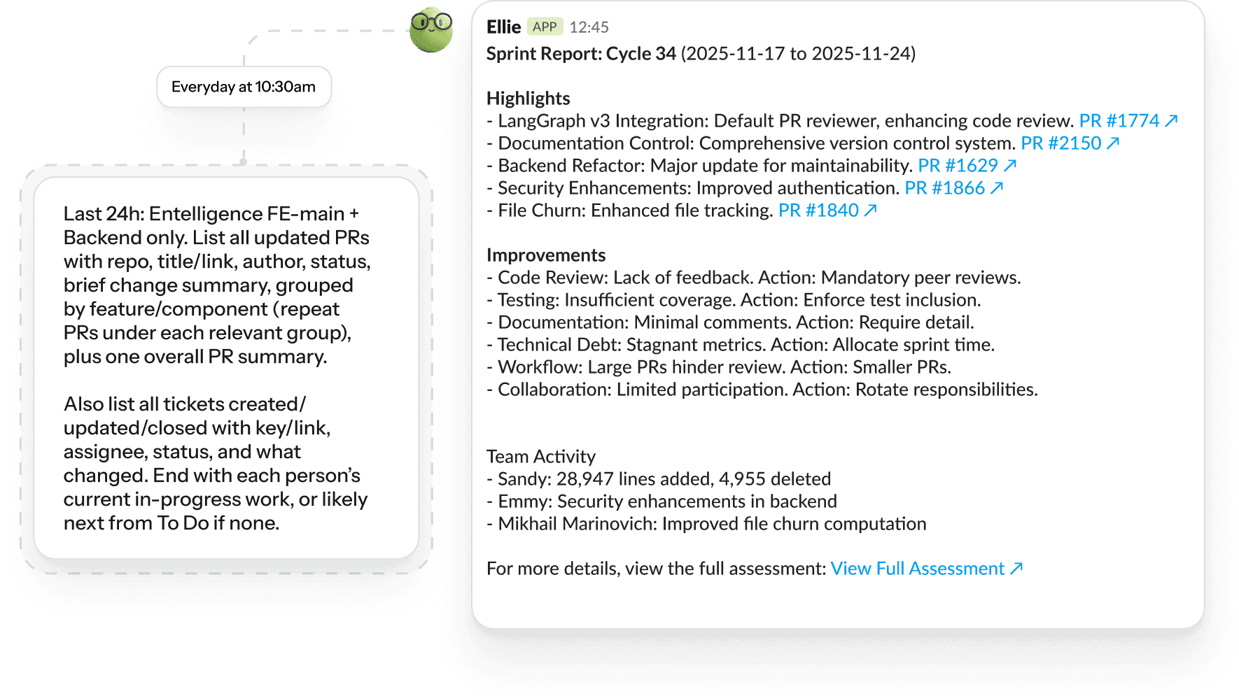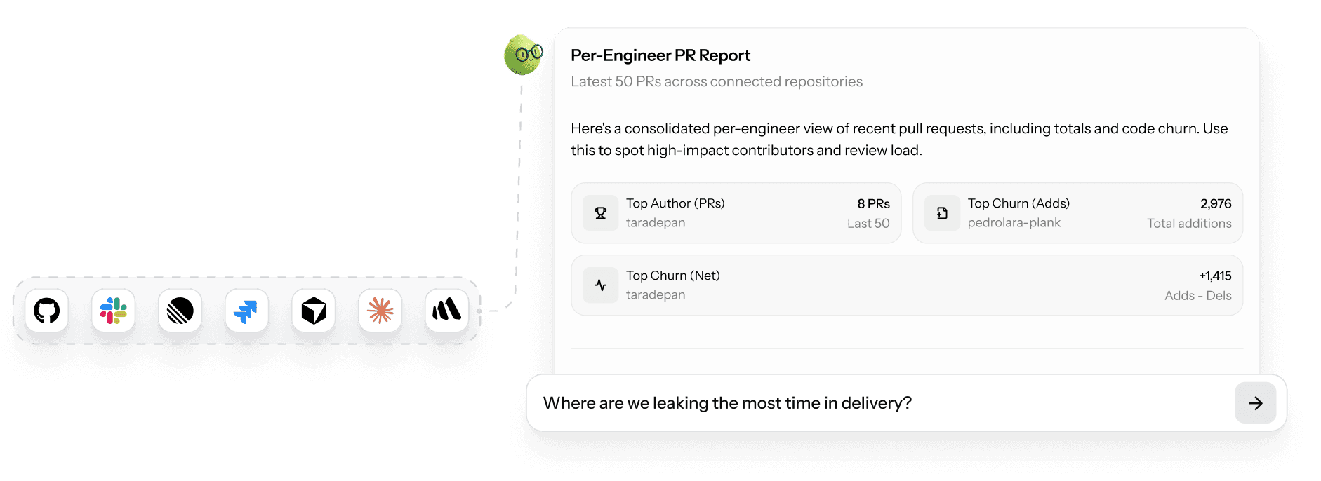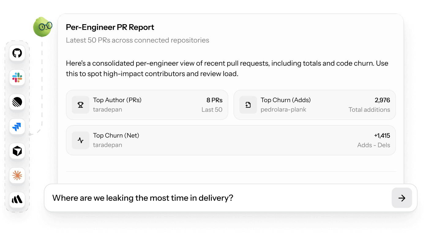 Ask about code, PRs, delivery, team performance, or sprint progress and get answers backed by real engineering data.