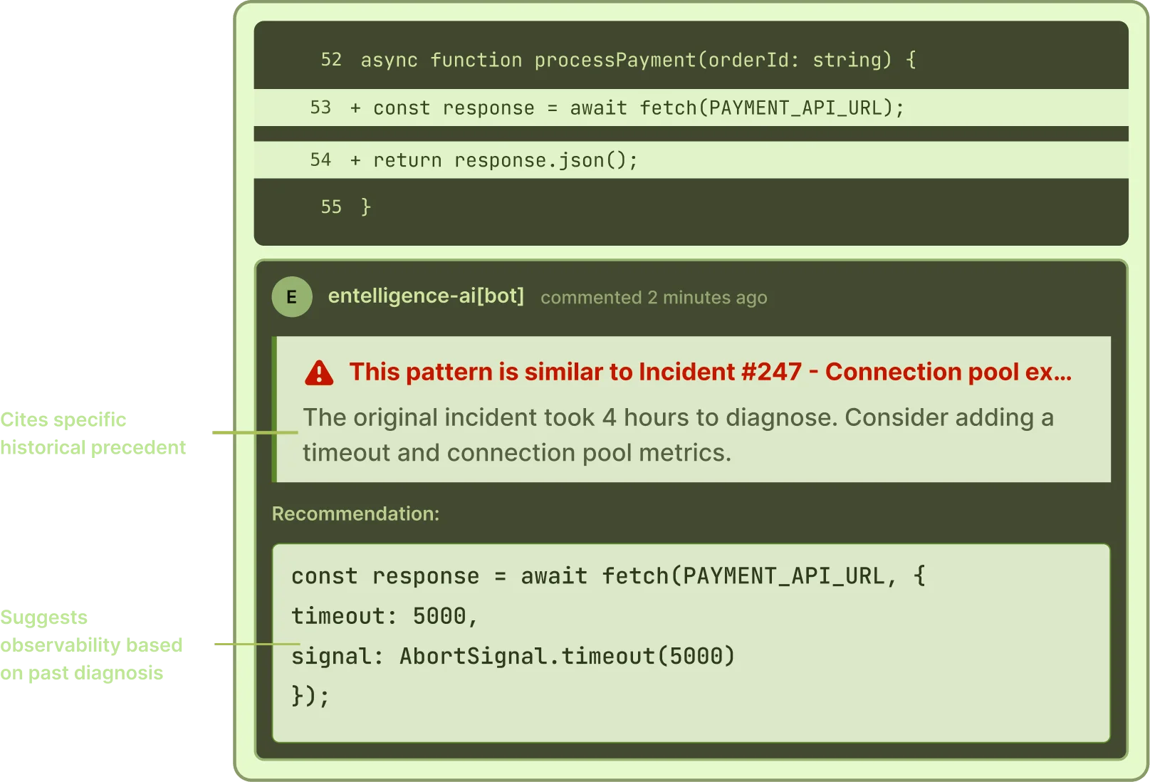 Most review tools read the diff. Ellie reads the diff and all your team's post-mortems, turning past failures into prevention.