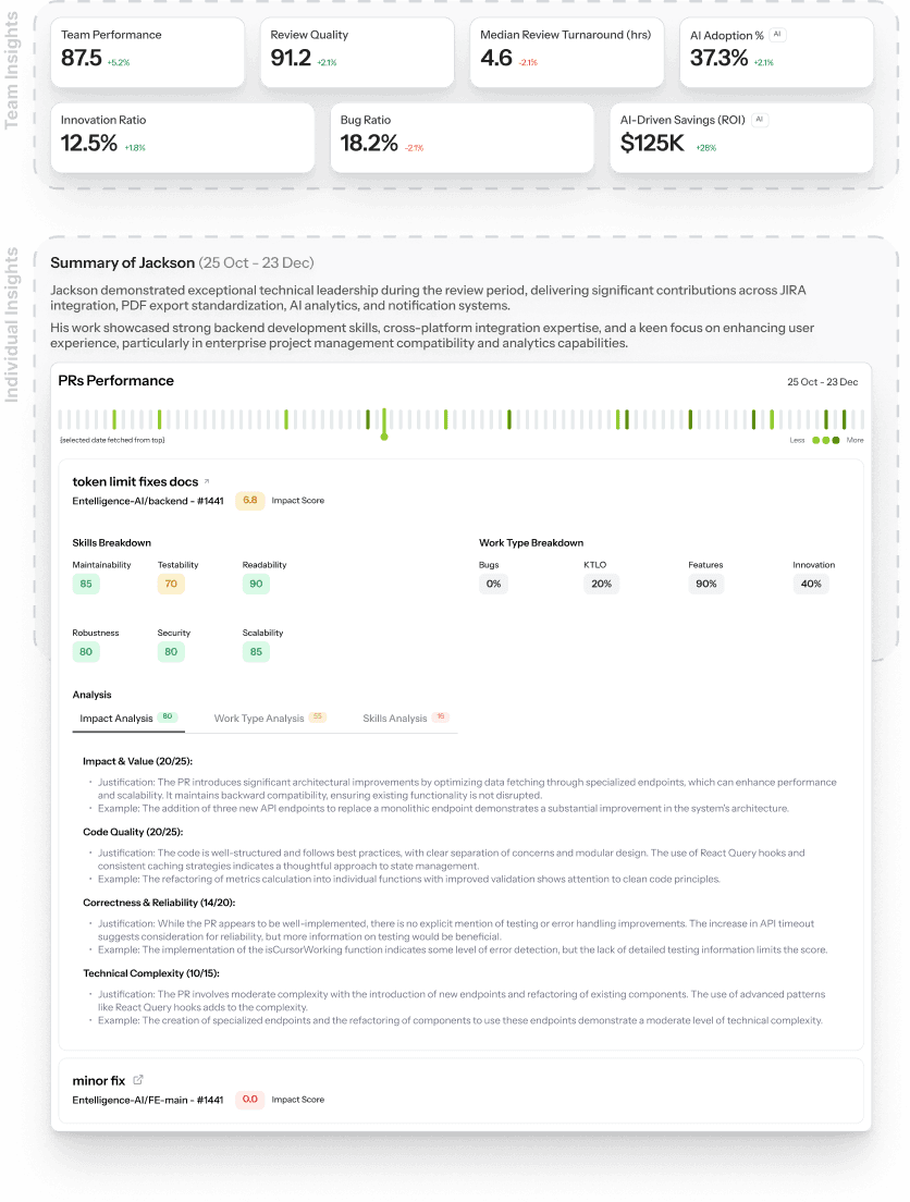 Complete visibility into team performance, impact, and how work flows from code to production.