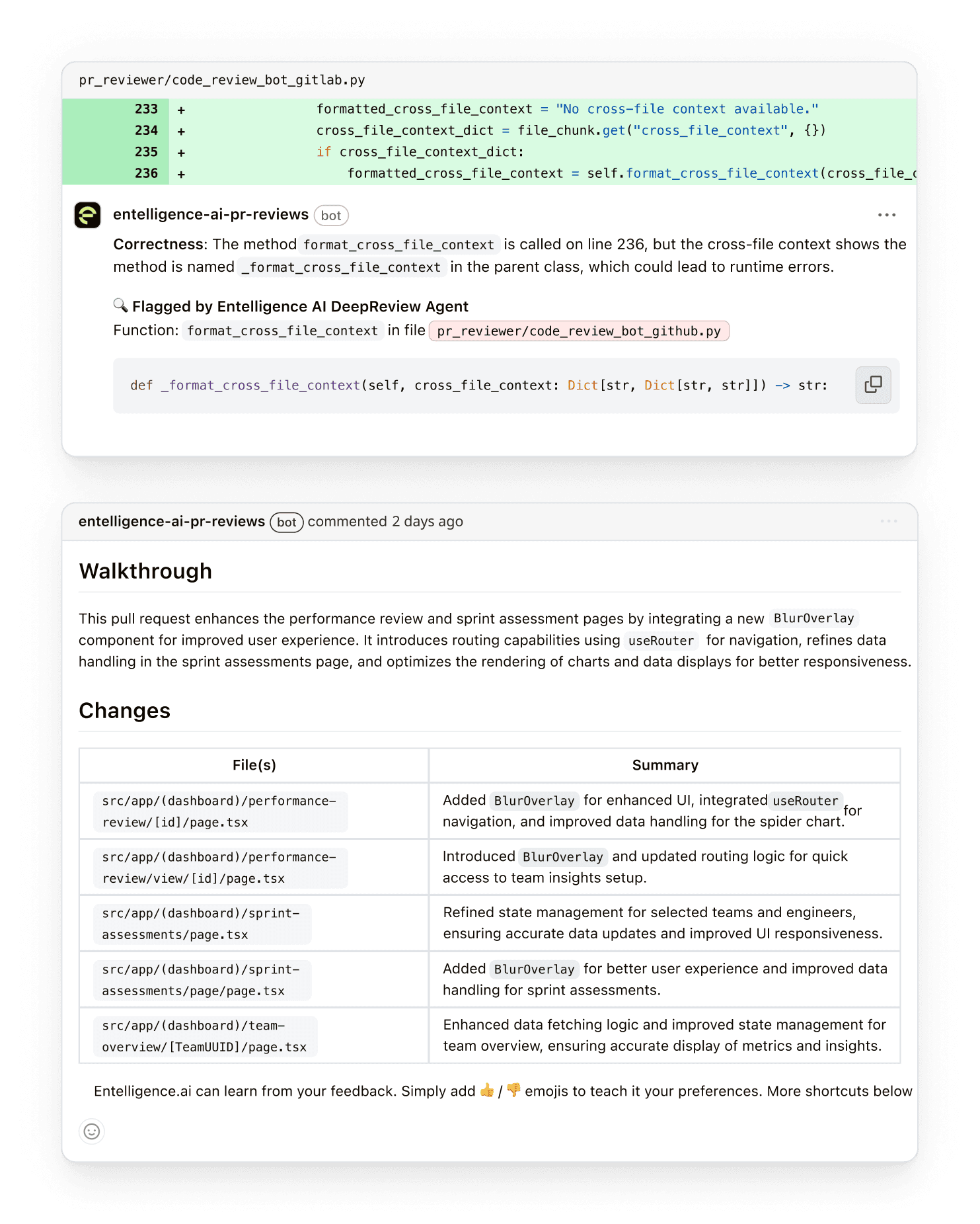 Entelligence caught bugs that had silently shipped before race conditions, unclosed resources, validation misses. The Al comments felt actionable & not noisy.