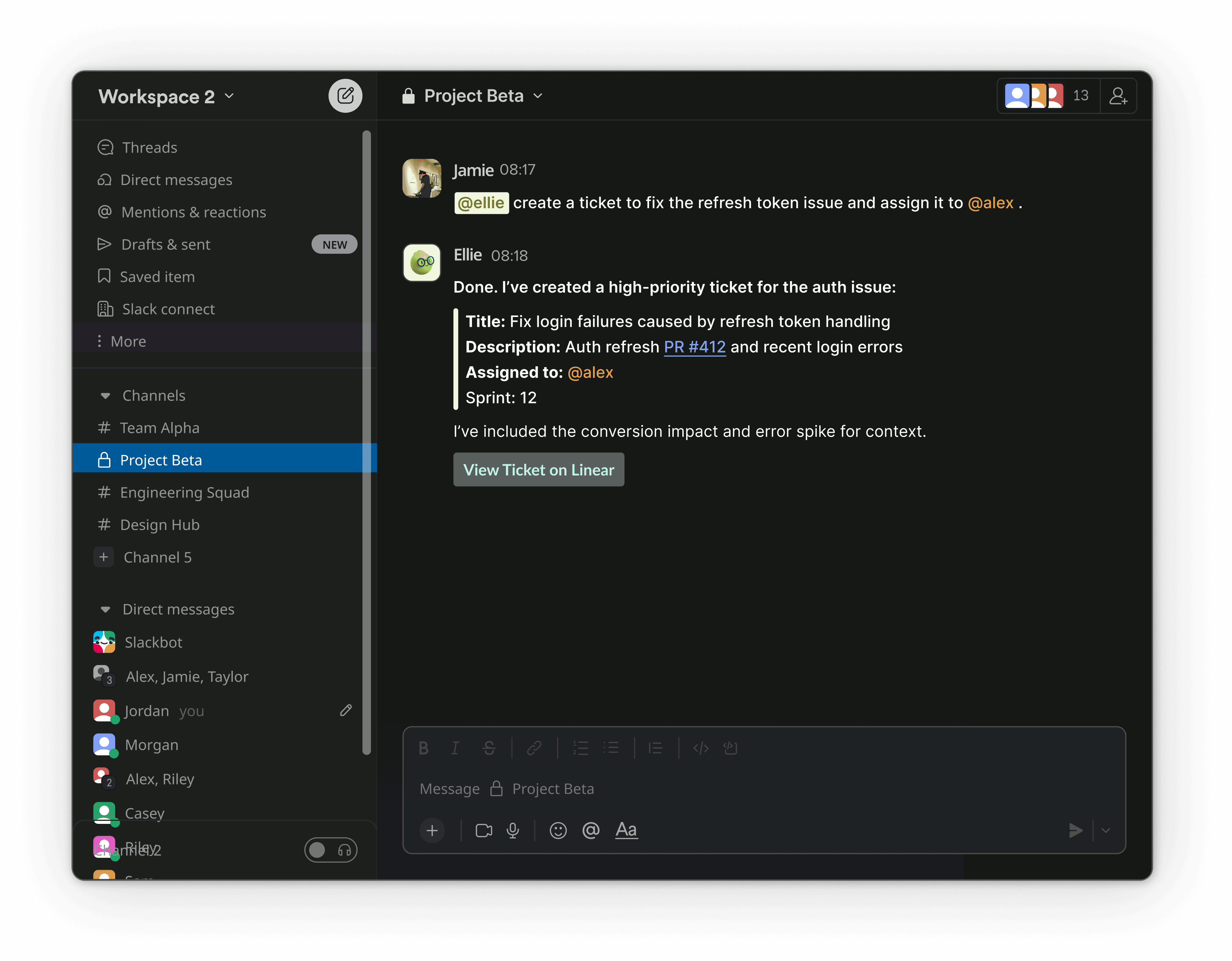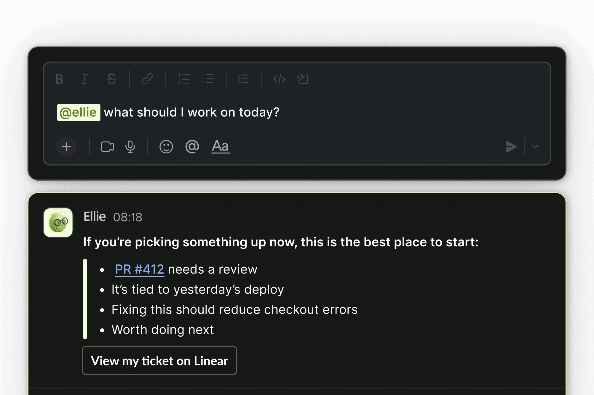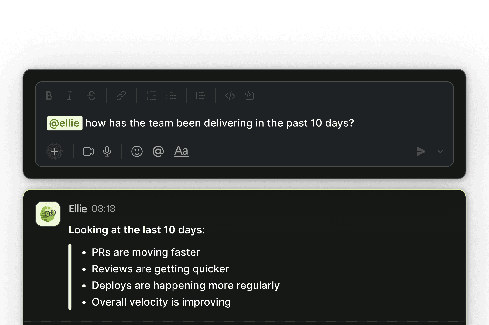 Ellie understands PRs, reviews, commits, and delivery flow from GitHub and Linear.