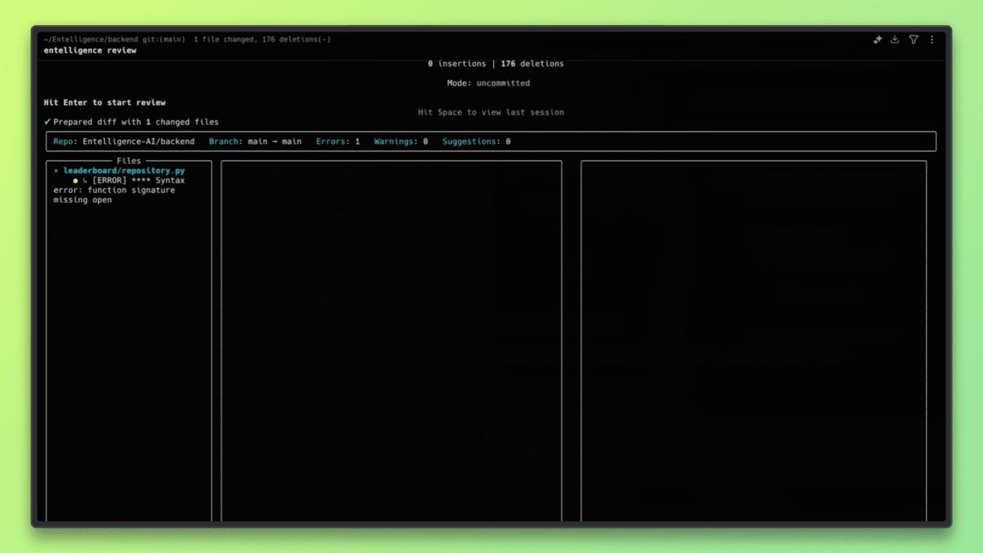Run the Entelligence review command from the root of your repository. The CLI will analyze the current local changes.