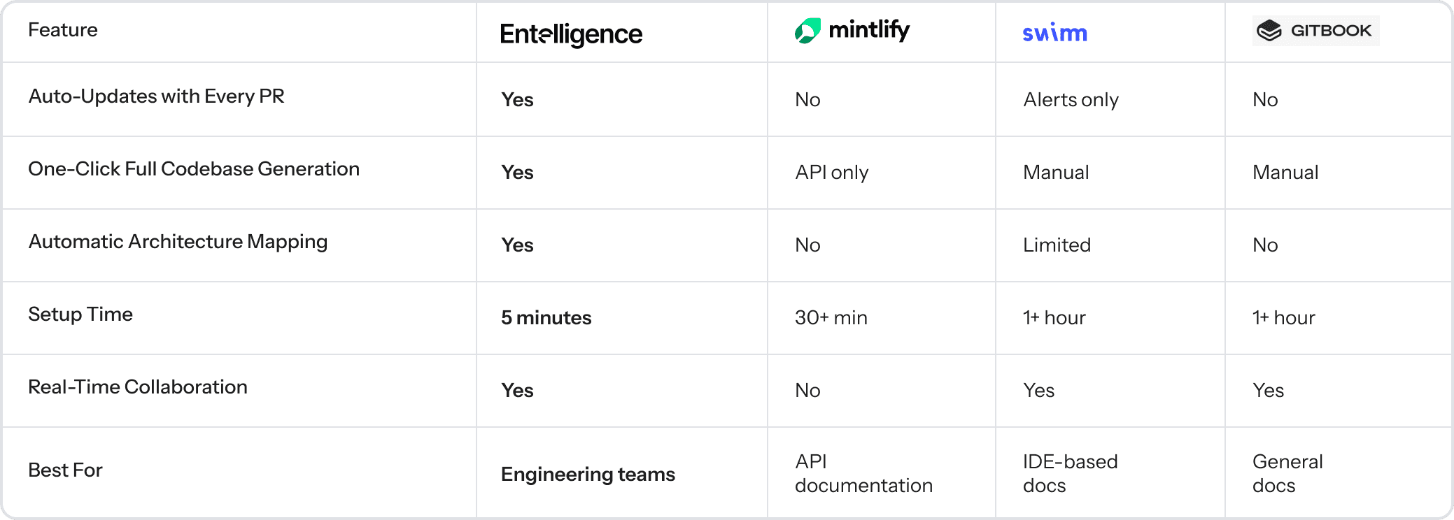 The comparison shows why teams choose Entelligence it's the only tool combining one click generation, auto updates with every PR, and complete architectural mapping.