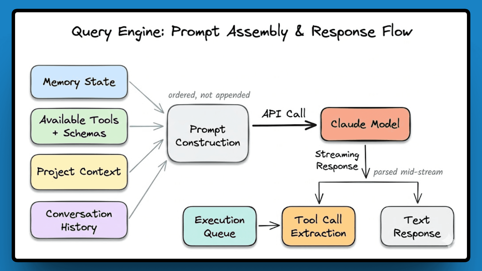 QueryEngine.ts sits at roughly 46,000 lines and owns the entire lifecycle of every model interaction, from assembling the prompt to parsing the response to deciding what happens next. Before a single API call goes out, the engine pulls together memory state, available tools with their schemas, project context, and conversation history. It constructs the prompt in a specific order rather than just appending everything it has.
