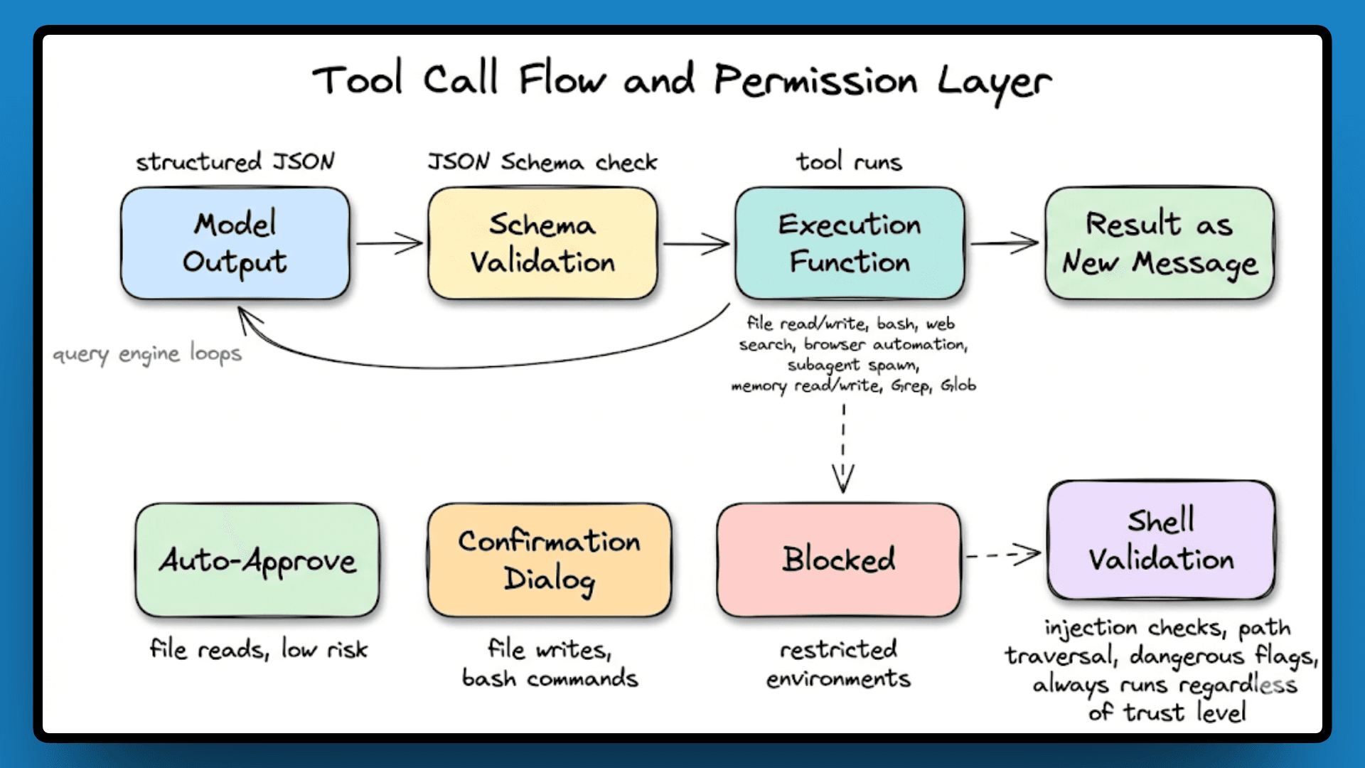 Every tool has four parts: a name, a description that the model reads to decide relevance, a JSON Schema for inputs, and an execution function. The model outputs structured JSON, the engine validates it, and if it passes, the tool runs. The result comes back as a new message, the query engine loops, and the model continues.