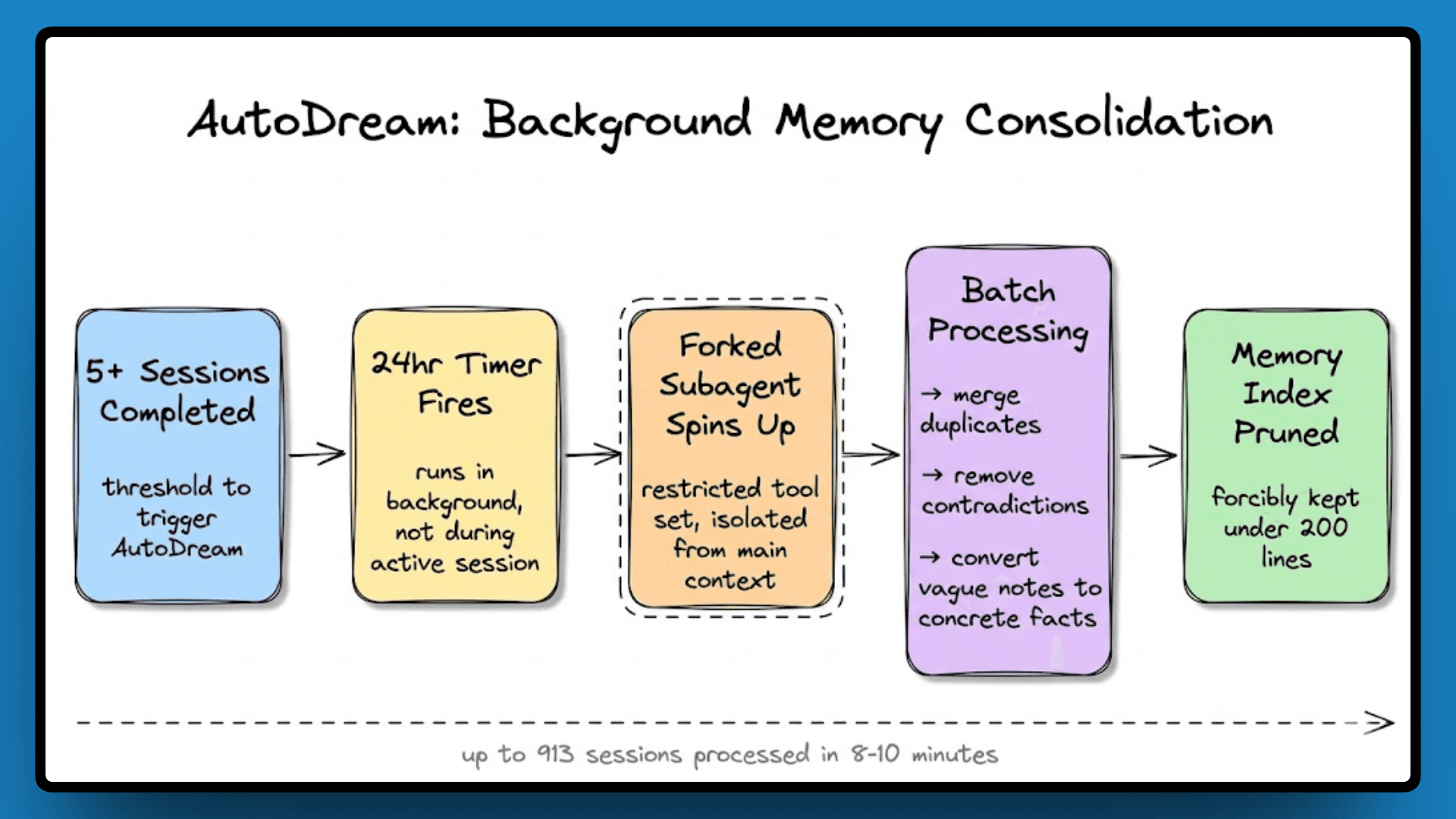After five or more sessions, a background process called AutoDream runs every 24 hours. It processes the session history in batches, merges duplicates, removes contradictions, converts vague notes into concrete facts, and then prunes the memory index back to under 200 lines.