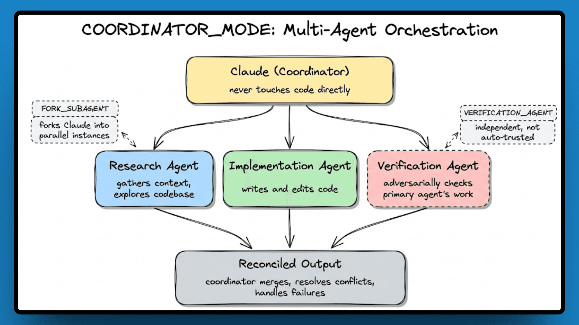 FORK_SUBAGENT lets Claude fork itself into parallel instances, and VERIFICATION_AGENT adds an independent agent that adversarially checks the primary agent's work rather than trusting it automatically.