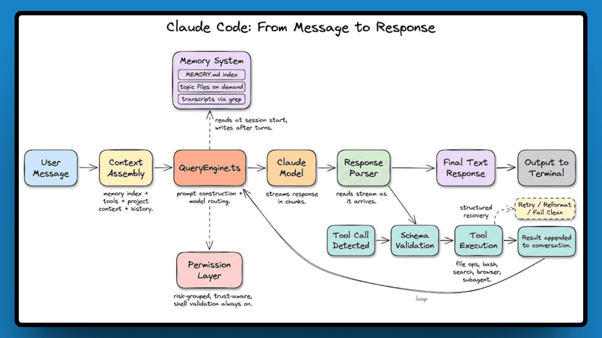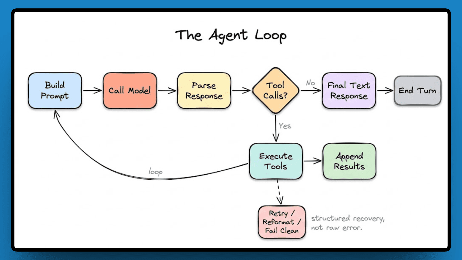 Every response Claude Code gives is the result of one or more passes through a loop: build a prompt, call the model, parse the response, and if tool calls come back, execute them, append the results, and loop again. This continues until the model returns a final text response with no further tool calls, at which point the turn ends.