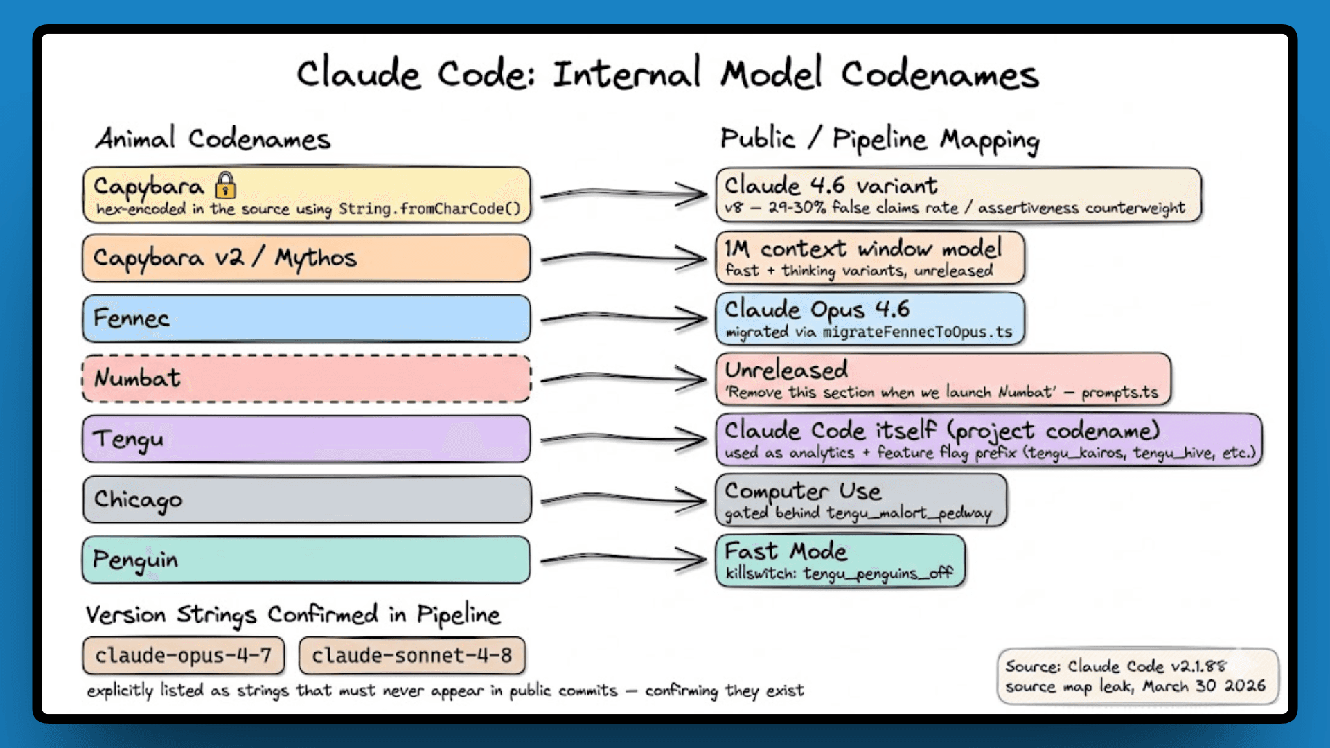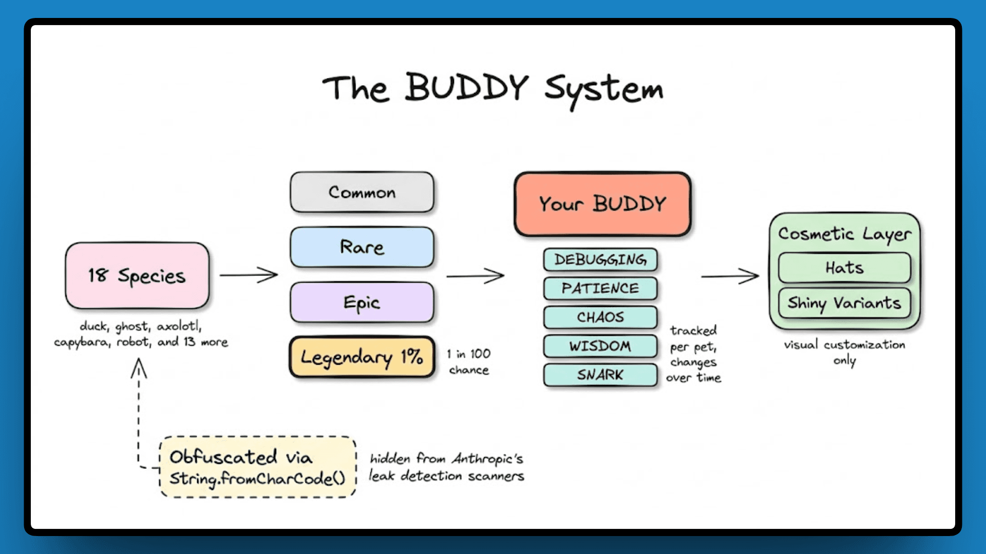 Which brings us back to Capybara. It is one of the 18 species in the BUDDY system, but the word itself is never written as plain text in the code. It is encoded using String.fromCharCode() because writing it directly would trigger Anthropic's internal leak-detection scanners. The codename for one of their unreleased models was hidden inside the source code to avoid being caught, and then that source code was shipped publicly inside a debug build on npm. That is the full circle of this whole situation.