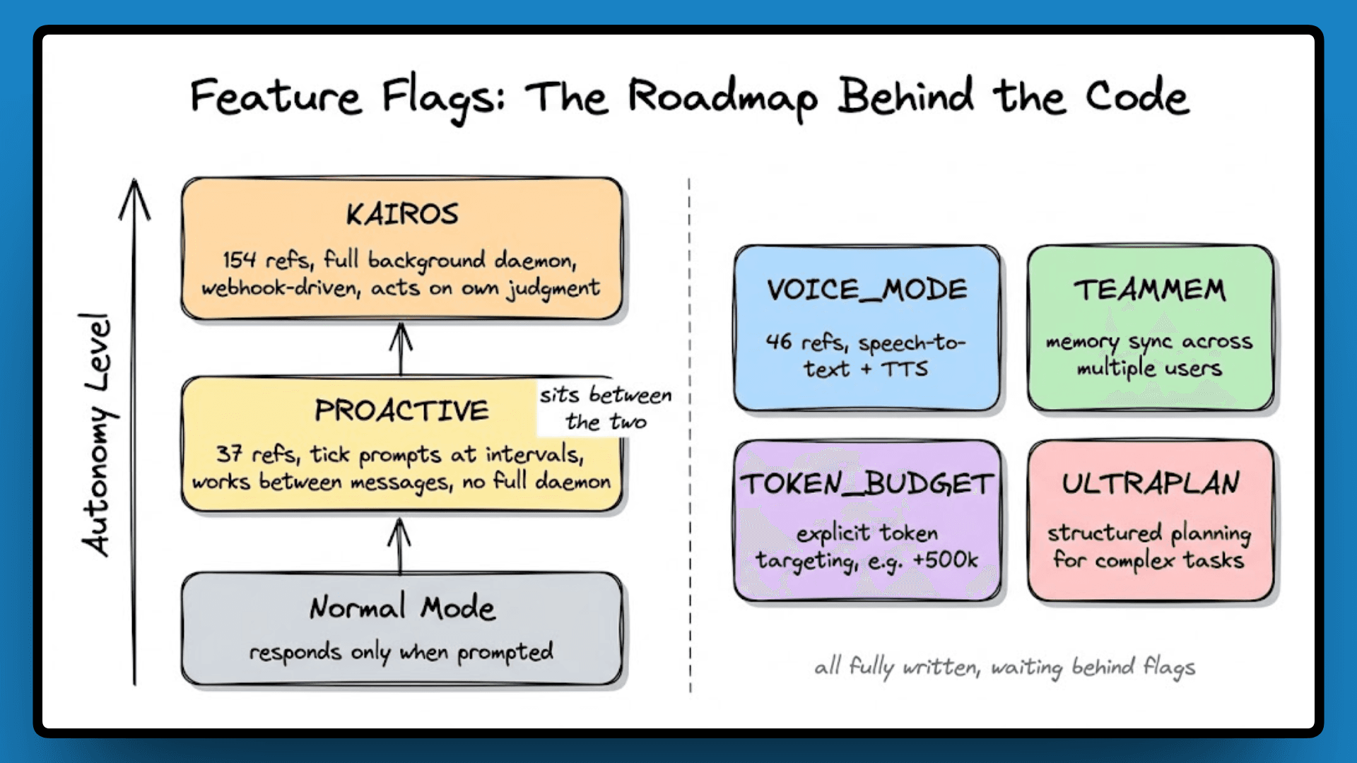 The flags in this codebase aren't toggling small UI experiments; they gate fully written subsystems, with complete code behind each one, not stubs or prototypes, which means the features exist and are waiting to ship. A few of them are significant enough to change what Claude Code fundamentally is.