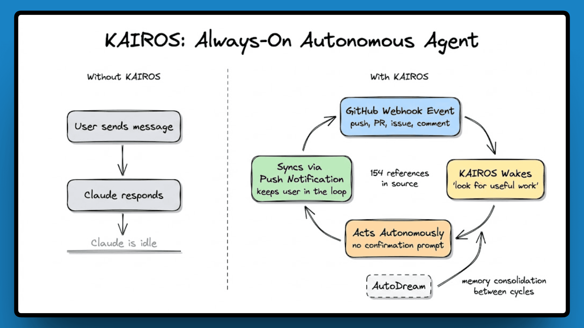 With 154 references, KAIROS is the biggest shift in the codebase. Right now, Claude Code responds when you ask it to. KAIROS turns it into a background daemon that keeps running between your interactions, watches your repository via GitHub webhooks, reacts to events without being prompted, and decides on its own what to work on next.