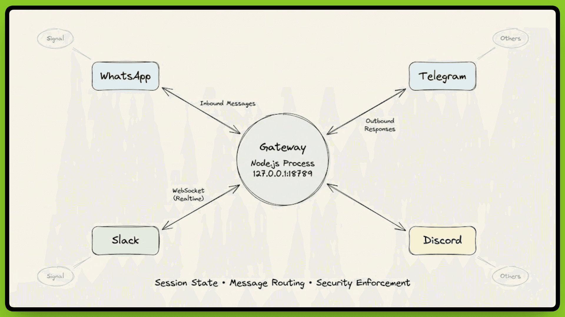 Regardless of where the process runs, connecting to messaging platforms requires authentication and security enforcement. That's where the Gateway's role becomes critical.