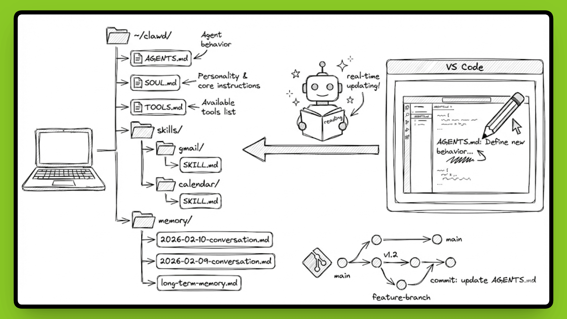 Open any text editor, and you see exactly what your agent knows. Want to check what it remembers about your last project discussion? Open the memory log. Want to modify how it responds to calendar requests? Edit AGENTS.md. Want to see what tools it has access to? Read TOOLS.md.