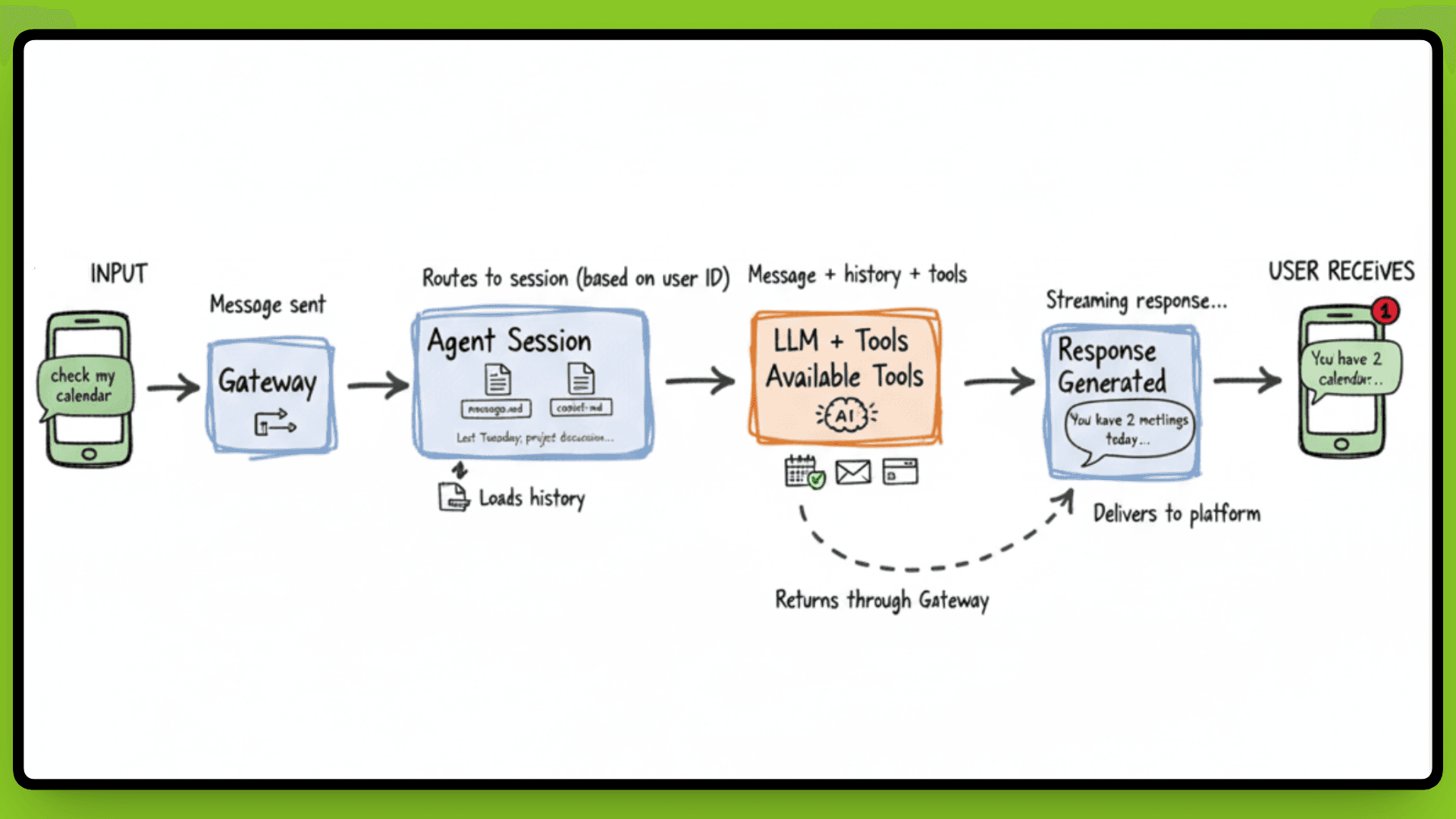When a message hits the Gateway, it doesn't just forward blindly to an LLM. There's a processing cycle that turns your "check my calendar" into an actual response with context.