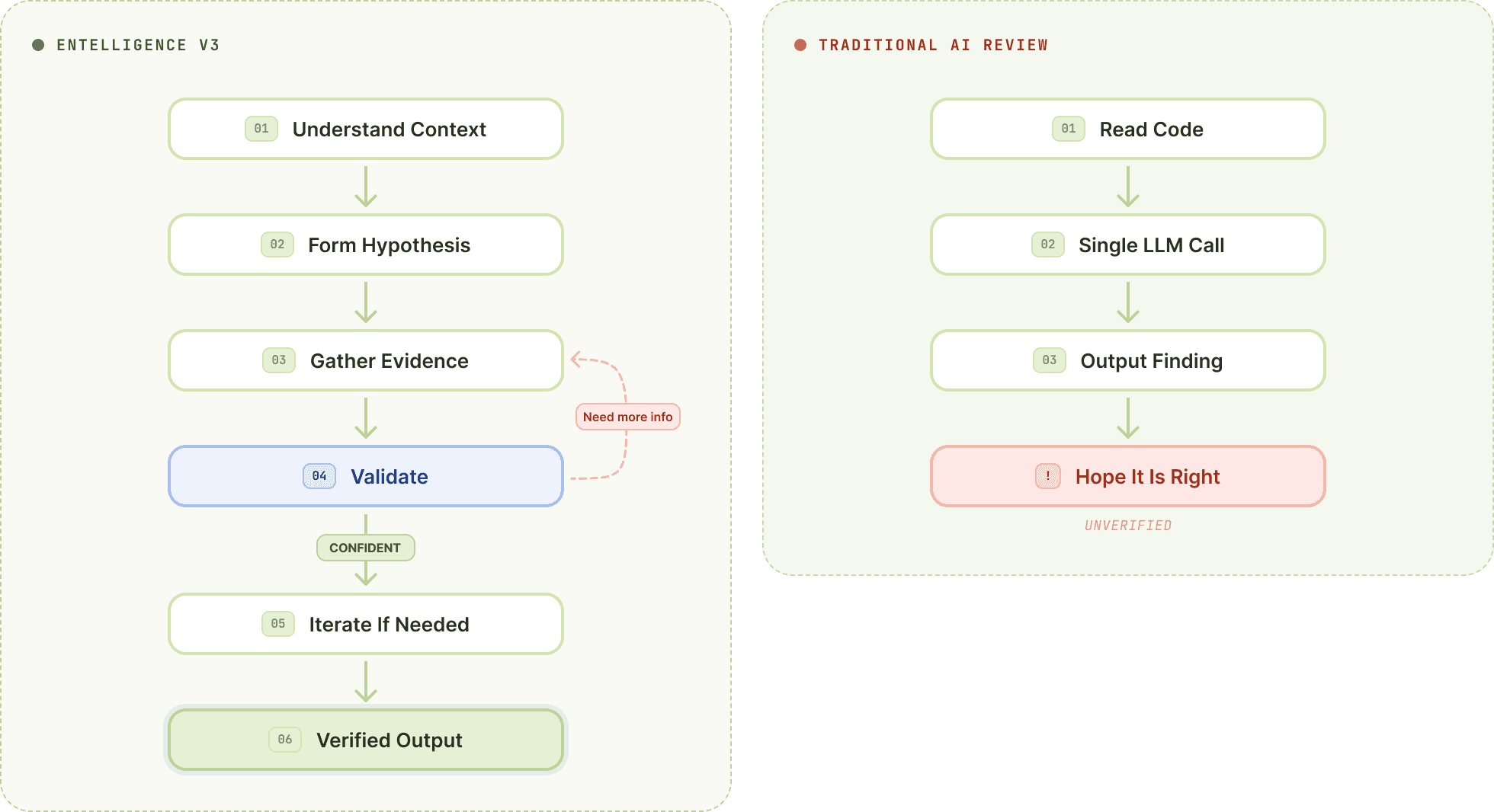 We're deliberately vague about the details. This is core IP. But the principle is what matters: single-pass review will always be limited by the quality of its first inference. Adversarial verification has the entire reasoning loop to correct itself.